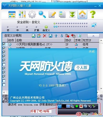 原来防火墙,杀毒软件都是咖啡的,这次把咖啡卸了,我就想起久违的天网了,去网上找了下新版.哈哈.有3.0啦..更惊喜的是原来那个难看的任务栏图标终于换掉了.哈哈…好看多了.