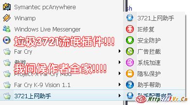 眼睛用的比较过度,酸酸的.很不想看电脑,可是睡不着.就起来,把电脑开了.打网页网速极慢.随意看下开始菜单,靠!发现3721!!本人坚决抵制这类垃圾流氓插件的.自己电脑都做了屏蔽,而且每次从网上下载软件安装时候都很小心,也安装了SSM软件安全防火墙.对垃圾插件深恶痛绝!因为我根本没有感觉到从垃圾软件得到的什么好处,什么便捷,带来的只有烦恼和繁琐!甚至于看到其他人电脑机器上有一堆垃圾流氓插件,我都会有些鄙视电脑的主人,如果遇到某些人说什么垃圾插件好,说什么3721太棒了,用途太好了!我真TM想小他一顿,傻B!