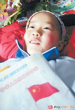 新闻提示:05年10月,7岁的小欣月摔倒在了学校的操场上,髓母细胞瘤给这个天真的孩子判处了“死刑”。3个月前,小欣月失明了。她最大的梦想就是能站在北京天安门前看升旗仪式,听国歌响起……好心市民愿意帮助欣月圆她的北京梦,但她身体状况不好,医生建议不要去。为了不让欣月失望,父亲编造出善意的谎言,决定在长春找一个有国歌响起的地方,到时就告诉她,那里就是北京天安门。几天以来,本报和无数热心读者一直为小欣月的“天安门”升旗梦构思着、忙碌着,大家都希望在她身体所能的情况下给她一个惊喜,让小欣月这个简单而又困难重重的愿望在长春能圆满的实现。可是此时,欣月的父亲告诉记者,欣月的病情突然严重了,“天安门”升旗的愿望需要尽快实现……