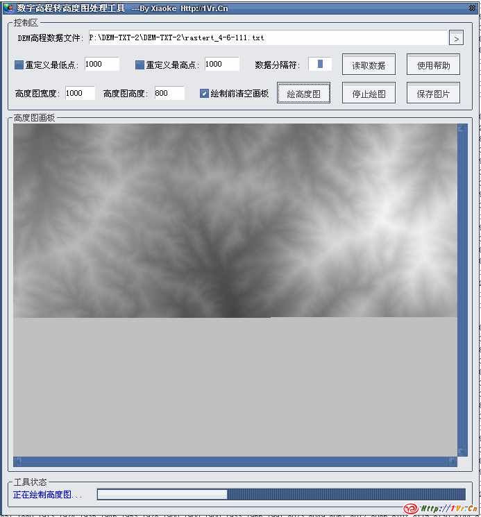 本工具可以将ASCIIGRID格式的DEM高程文本数据转换为对应的高度图