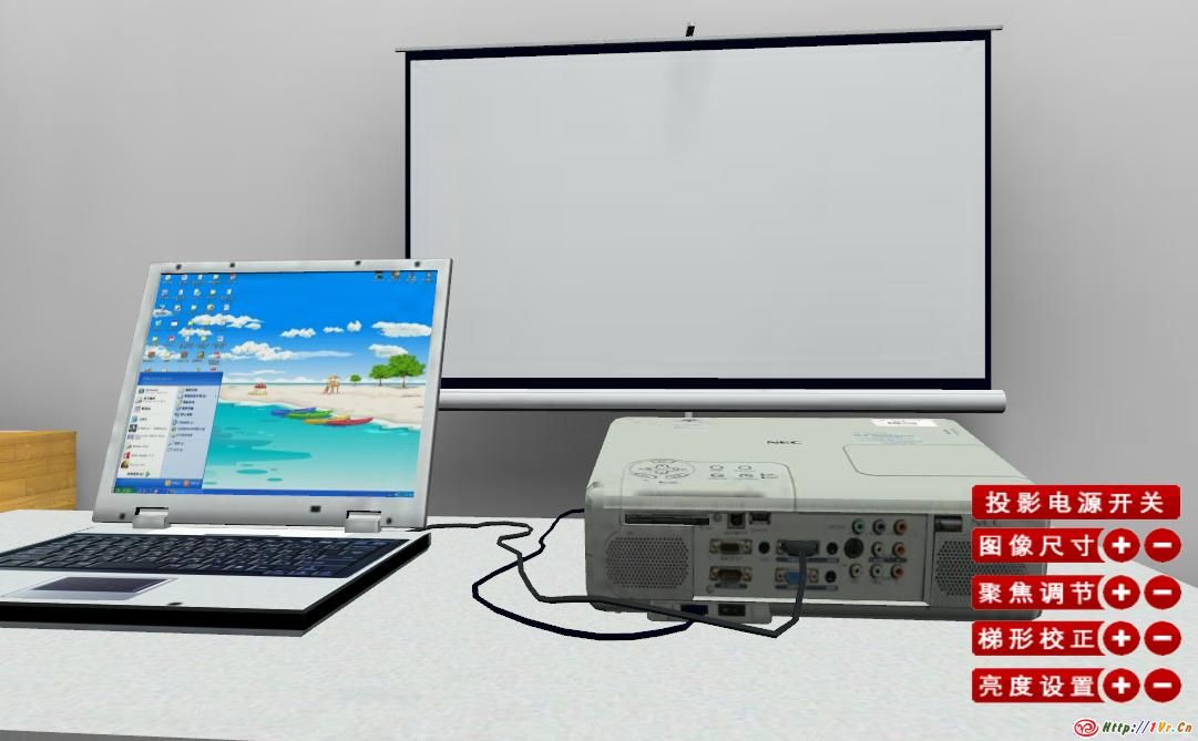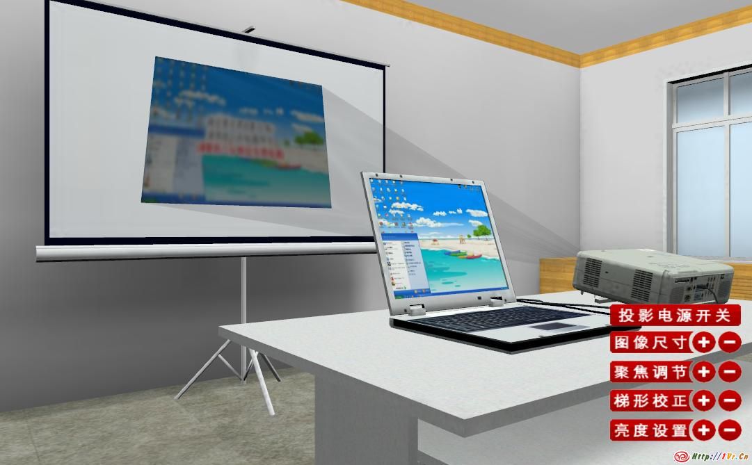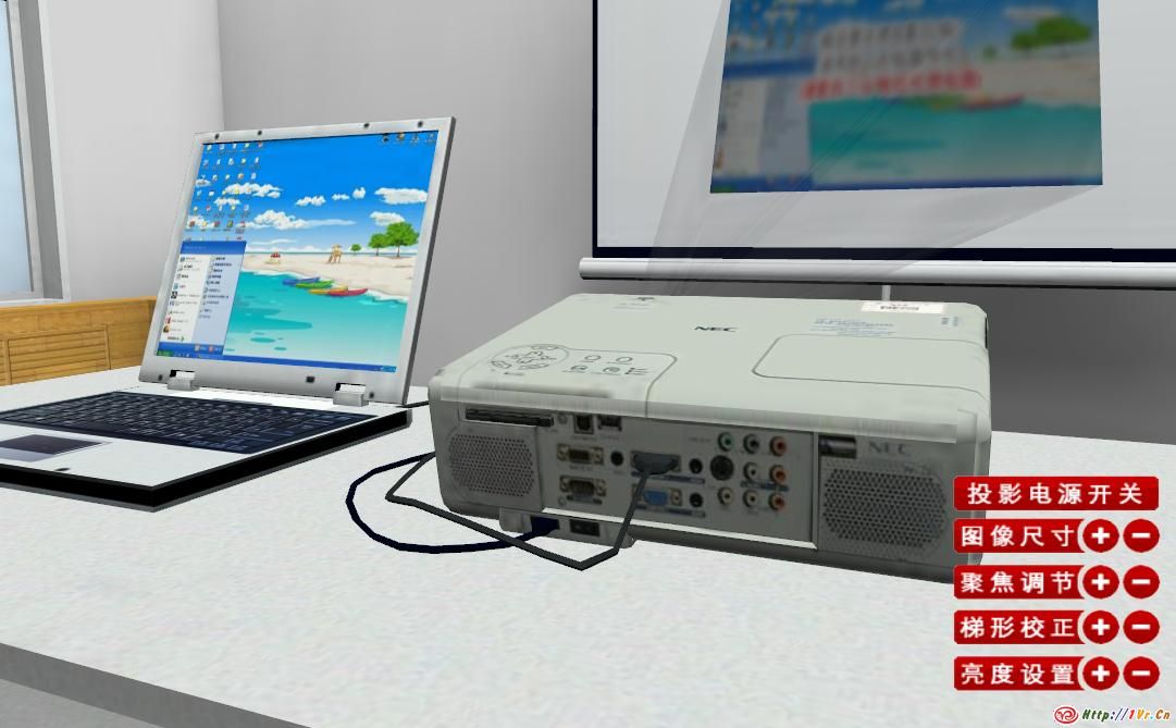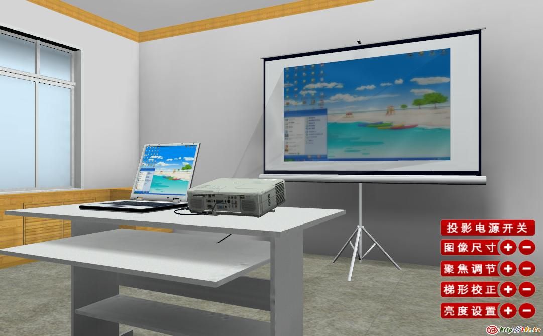 此演示实现了投影机的虚拟模拟,当靠近投影仪的时候,屏幕右下角弹出控制菜单,可以进行投影仪的开关,亮度调整,梯形调整,聚焦调整,图像大小调整等等模拟.本例以NEC VT770投影仪为原型进行虚拟仿真.投影仪后方的插口均有提示说明,方便学习使用投影仪.