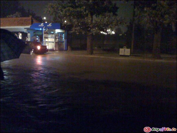 准备坐车回家时已经晚上十点多了,公交车慢悠悠的开着,突然开始下雨,雨大的完全出乎我的想象.下车,急忙的钻到车站雨搭下,看表11点了.雨点砸脑袋,路面上积水也非常多,足足超过10厘米.媳妇肯定睡了,就想着怎么办呢.