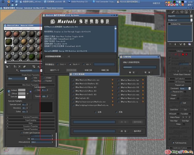 花了几天时间构思和编写,我的Maxtools 2.0插件诞生了.可以查询定义的热键.添加N个脚本工具,可以选择性安装和卸载Maxtools,也可以将修改过的插件同步到原程序….很满意.呵呵.因是个人定制化工具,所以无法与大家分享,只能让大家看看界面图了.