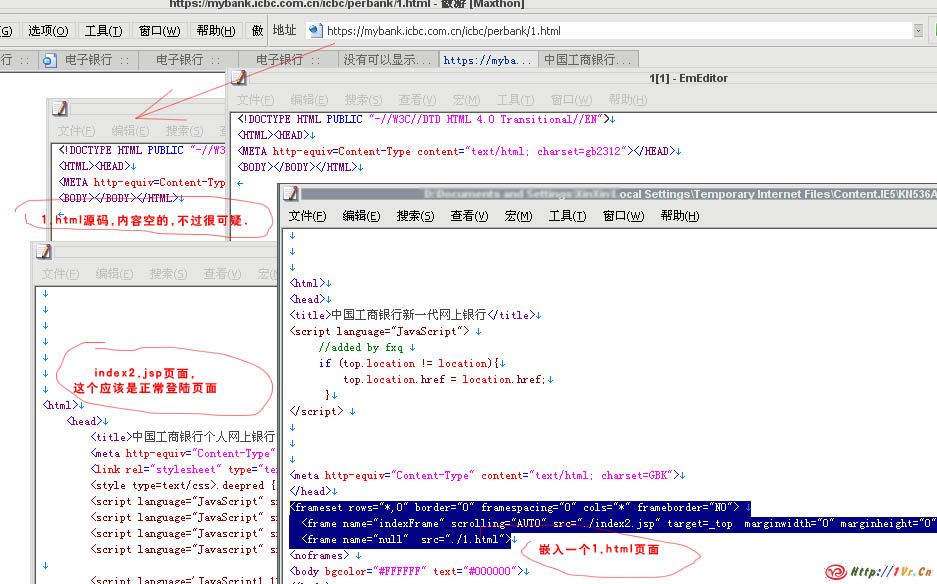 今天去工行网银,先网页无法打开,后来打开了速度极慢.查看登陆页源码,貌似被挂马了.反正感觉不太正常,好好网页怎么突然被嵌入了一个frame.查看各个页面源码,没发现什么特别的地方,嵌入的1.html好像是空页.不解.询问工商论坛客服.答复”我行网站运行正常,请您放心使用。”