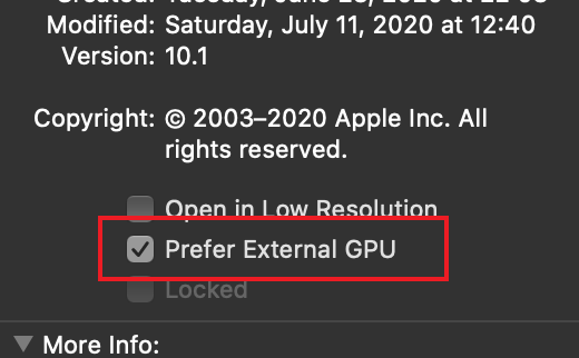当连接了eGPU后,所有的应用属性中将增加”Prefer External GPU”,即预设当前应用程序使用外置显卡: