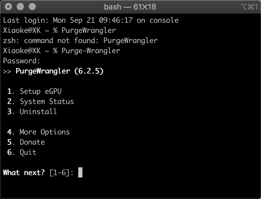 重启电脑正常进入系统,在有网的状态下使用终端输入下列命令下载安装PurgeWrangler(官网:https://github.com/mayankk2308/purge-wrangler),用来解决使用eGPU五国等问题:
