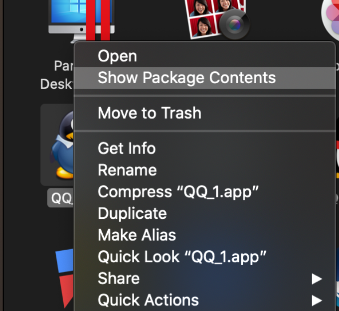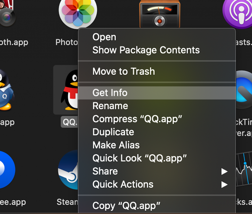 Resourecs窗口不要关闭,再新开一个Finder窗口,找到安装好的QQ,在QQ图标上右键选择获取信息项: