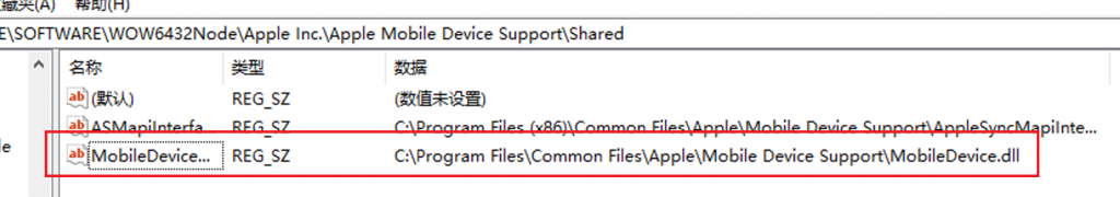如果缺失这一项,则新建一个字符串项,名称为 MobileDeviceDLL ,路径指到 MobileDevice.dll,该动态库可以在iTunes安装路径下找到,如C:\Program Files\Common Files\Apple\Mobile Device Support