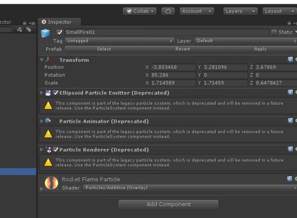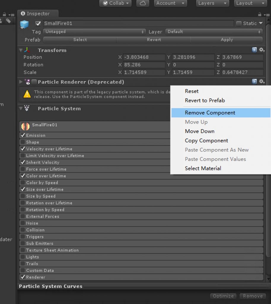 Unity2018.2.x之后,旧版 Particle System 相关API就完全移除掉了,这个升级器是Unity官方发布的,它可以ParticleEmitter, ParticleAnimator, ParticleRenderer等组件转换为ParticleSystem 和 ParticleSystemRenderer组件.在Unity2017.x版本中,旧版粒子系统组件将会这样提示: