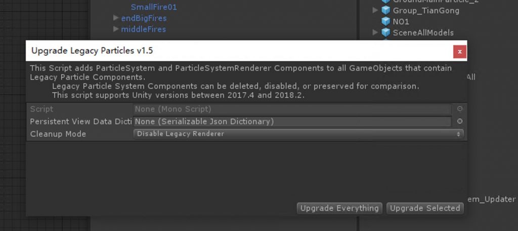 点击后弹出升级器的窗口,点击后将在所有带有旧版粒子系统的Gameobject上添加新版粒子系统组件,同时旧版的组件将禁用:
