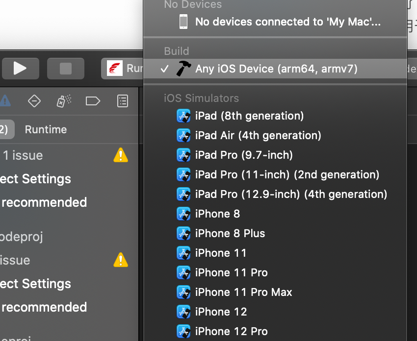 在打开的Xcode中配置APP的签名,根据需要链接设备,如实体机则确认USB线缆链接到了iOS设备,如模拟器则 open -a Simulator 打开运行一个虚拟机,Flutter将根据当前连接的设备进行相应的编译,如没有连接实体机也没有开启模拟器,那么使用run命令将编译出H5版本.