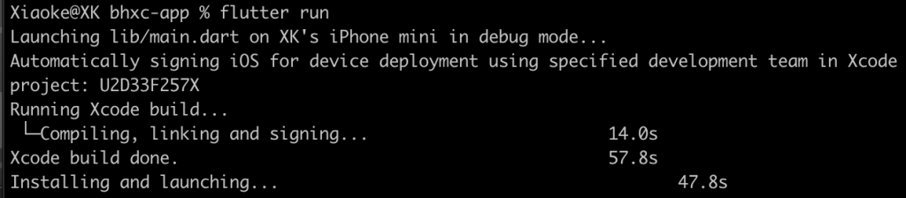 上图这种状态(没有连接实体机)且没有运行任何模拟器,将不能自动编译出iOS APP,确认签名置好后再次回到终端窗口,输入如下命令让Flutter自动编译运行: