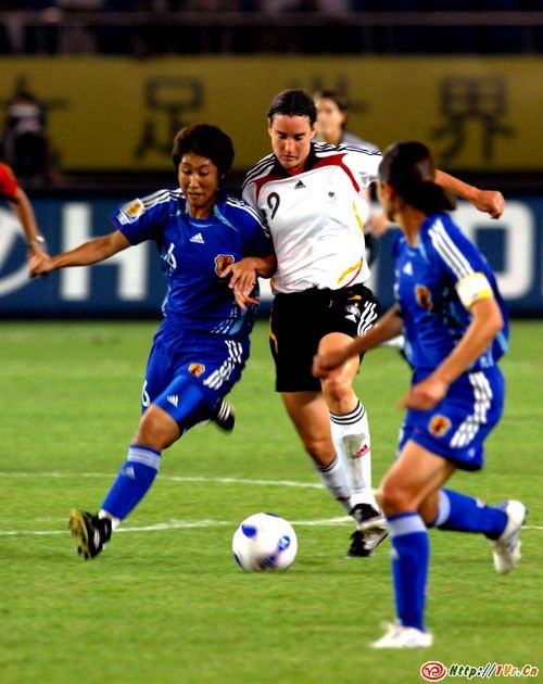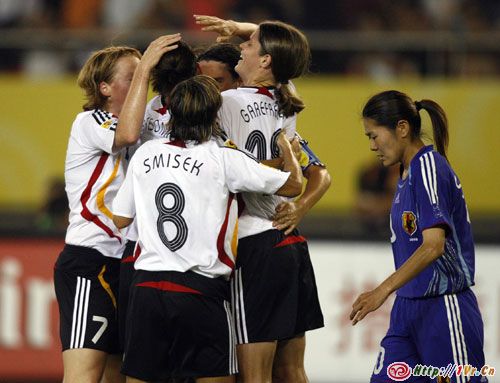 晚上八点,比赛准时开始,先开球的是德国队。德国队一开场就展示了强大的实力,不愧是上届世界杯得主。她们利用身体和速度优势,完全将日本队压着打。当德国队拿球时,全场爆以热烈的欢呼声和呐喊声,气氛异常火暴。第3分钟,德国队禁区前沿作配合,普林茨将球非常隐蔽的直塞到禁区内,插上的温博斯基形成单刀,在点球点处起脚射门,福元梅穗将球托出底线。仅过了1分钟,普林茨在肋部将球直塞到日本队禁区内,插上的斯米塞克在小禁区左侧斜射,皮球稍稍偏出底线。但当日本队拿到球时,全场就报以强烈的嘘声,“狗日的”、“小日本”充斥着黄龙体育场的上空。这里完全成了德国队的主场。当第20分钟,斯米塞克右路直塞日本队肋部,温博斯基拍马赶到带球突到小禁区右侧后,起脚大力射门,被福元美穗封出底线。林格尔将角球传到门前,加雷弗雷克斯头球摆渡到后点,无人盯防的普林茨捅射破门,打入本场第一粒进球。全场的气氛达到了最高潮,欢呼声、呐喊声、敲椅子声将黄龙体育场整个的笼罩在足球的激情之中。同学Y也高呼“女神,我的女神,普林茨终于进球啦!”。我内心也激荡起万千豪情,看见德国队将日本队灭了,是一件大快人心的事情。