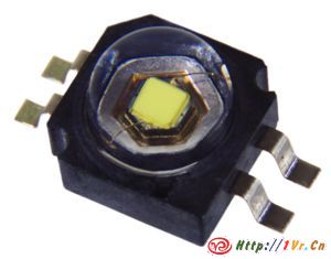 在手电厂商忙着研制和改进手电的时候,Lumileds也在着手研发新的LED。LD封装之后,SE(Side emitter)和HD(High Dome)封装被应用。 SE的透镜类似一个漏斗,可以把LED向前发出的光线折返回来,这样可以让较浅的反光碗也能收集到足够光线。HD则拥有一个半球型透镜,发光体位于球心,这样球壳对发光核心折射作用被减小到最低,光线可以自由辐射出去,发光形态被认为是最接近灯泡手电的,HD封装在应用上获得了巨大的成功,LD的封装则逐渐被淘汰了。更大功率的LED也被开发出来,典型的就是Lux V,功率达到5W左右。在电气结构上,采用两只1W管脚串连,所以驱动电压是普通LED的两倍,达到接近7V,物理结构上则是把四个1W核心田字型排列,通过增大发光体面积来获得更高的光通量。