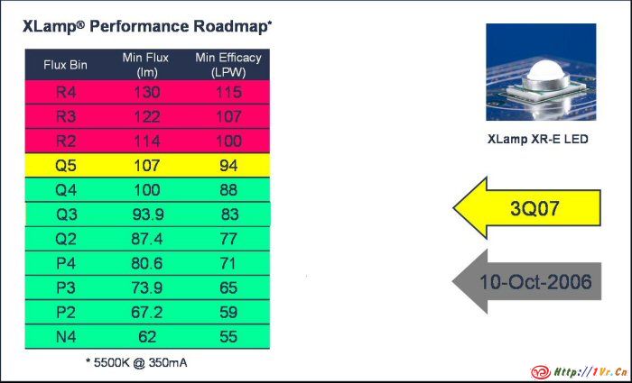 Cree的LED是否会进一步升级呢?回答大概是肯定的,现在已经有经销商预售在产品目录里面还没有标出的Q4 Bin甚至Q5 Bin 7090XE-E,350ma下光通量分别是100.4-107 lm和107-113.6 lm,可以预见,Cree和Lumileds的竞争将会十分精彩,类似过去数年Lumileds一家独大的局面是一去不复返了。