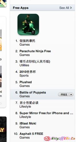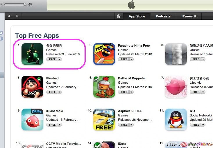 应客户要求游戏名称只有中文”倔强的摩托”以及中文的游戏介绍.不过是面向全球发布.短短5天就杀到中国区免费排行榜第一名,令我十分兴奋.出乎我意料,我想如果是英文名称及英文介绍,其他国家区也应该能排上一些名次吧.