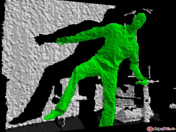 Kinect骨架追踪处理流程的核心是一个无论周围环境的光照条件如何,都可以让Kinect感知世界的CMOS红外传感器.该传感器通过黑白光谱的方式来感知环境:纯黑代表无穷远,纯白代表无穷近.黑白间的灰色地带对应物体到传感器的物理距离.它收集视野范围内的每一点,并形成一幅代表周围环境的景深图像.传感器以每秒30帧的速度生成景深图像流,实时3D地再现周围环境.如果你玩过pin point impression 3D针模玩具可能更容易理解这一技术——将你的手(或者脸,如果你愿意的话)按压在这种玩具上,就可以产生你身体某一部位的简单3D模型.