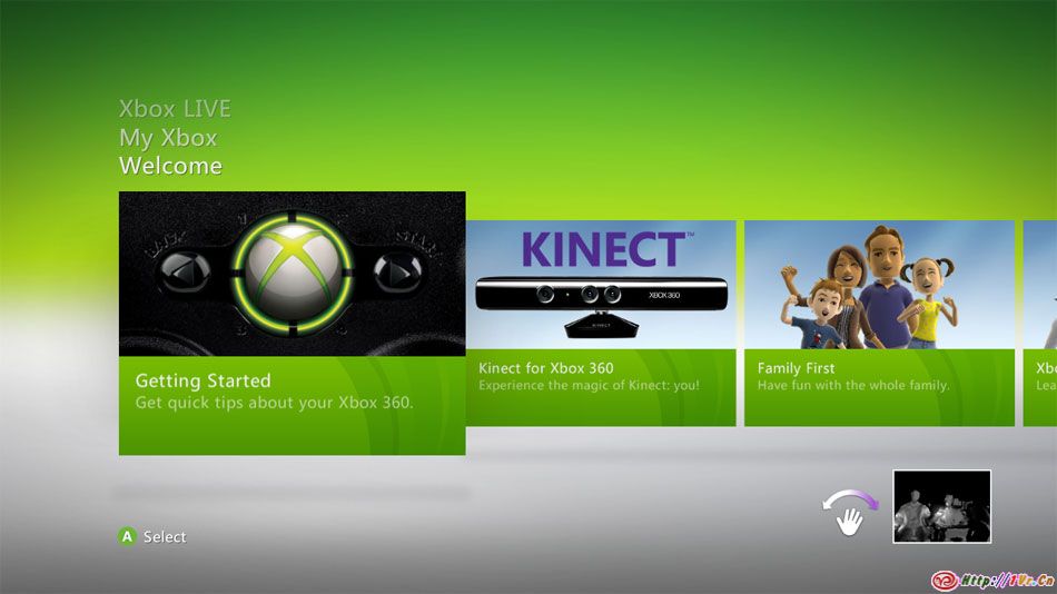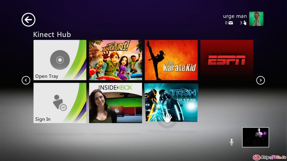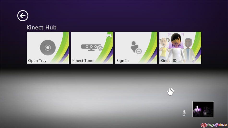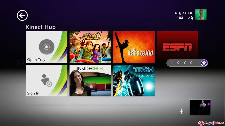 Kinect Hub是Xbox Dashboard中的Kinect体验中心,在这里你可以用手势来访问Kinect内容.Hub的设计简单且容易理解,你可以注意到我们采用了巨大的颜色分明的项目方块,让用户轻松地找到并选择他们所想做的事.