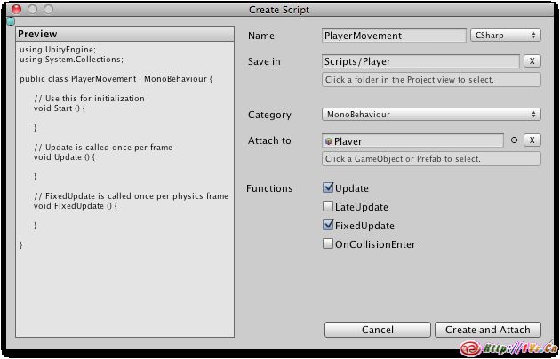 可以看到,可以在所选的目录中创建新的脚本.也可以重命名脚本,如果是C#脚本,重命名的时候类名也会随之改变.也能很方便的讲脚本赋予游戏对象.